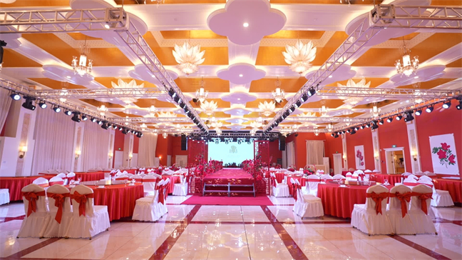 皇宮廳—金碧輝煌、皇宮式裝修,面積1038㎡,層高8.6米,配備愛情階梯、軌道威亞、二層觀禮臺、浪漫燈光秀、旋轉升降舞臺、頭頂天幕連接開合大屏。可承接50桌的大型宴會,也可舉辦600人的大型會議;還可用作會展、車展場地,每逢節假日還為市民上演文藝節目。